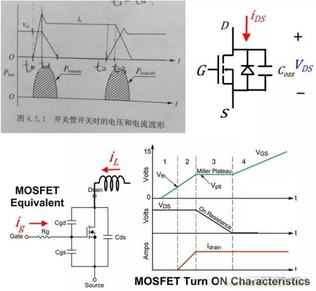 這里就用MOSFET代替BJT了,所以ids = ic,Vds=Vce,Coss也就是Cds代表輸出電容。簡單來說就是當(dāng)MOS管一開始導(dǎo)通時輸出電容Coss還保持Vds電壓,隨著Ids電流越來越大,Vds電壓終于保持不住,開始下降。直到管子完全開啟。比較詳細(xì)的開啟過程是由Miller Plateau造成的,這里借用了網(wǎng)上一些解釋Miller Plateau的圖,如果有不清楚的就請見諒了。