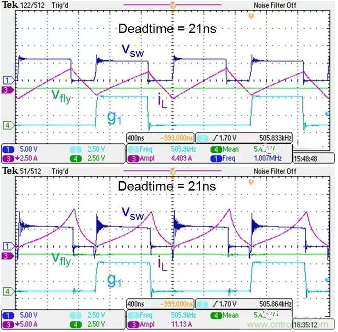 對于half bridge 實現(xiàn)ZVS turn on,我們希望當(dāng)上管Q1開啟時電流是流進(jìn)switching node (vsw)的,也就是圖中電感電流為負(fù)值,當(dāng)下管Q2開啟時我們希望電流是流出switching node (vsw)的,也就是電感電流為正值。為什么這樣就可以實現(xiàn)ZVS turn on了呢?我們就看上管Q1開啟過程。如果電感電流iL為負(fù),這時候我們先關(guān)閉Q2,這時候Q1還未開啟,在這個deadtime中iL會charge Q2的Coss,使Vsw抬高到Vin,當(dāng)然不能超過Vin,因為Q1的body diode會導(dǎo)通,鉗位住Vsw到Vin,這時候Q1的Vds就是Vin-Vsw=0,這時候我們開啟Q1就實現(xiàn)ZVS了。同理對于Q2開啟時,如果電感電流為正,那么當(dāng)我們首先關(guān)閉Q1管時,Vsw就會被電感電流拉低到0,因為iL》0, Q2的Coss會discharged到0,然后我們再開啟Q2,就可以達(dá)到ZVS了。這里我有一張其他Topology的PWM converter的波形圖,也和buck工作原理類似,大概可以看看基本原理,也就是電感電流為負(fù)時,Q1可以實現(xiàn)ZVS,讓Vsw的ringing比較小。而當(dāng)電感電流為正時,實現(xiàn)不了ZVS,Vsw的ringing就比較大了。