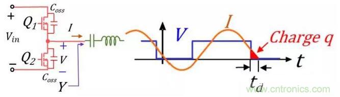 這是因為如果電流I是滯后與電壓V的,這樣在Q1開啟之前電流I為負(fù)值就會charge Q2的Coss,同時discharge Q1的Coss,讓V到Vin,這樣Q1就實現(xiàn)ZVS turn on了。Q2開啟之前,電流I為正,也會discharge Q2的Coss,和charge Q1的Coss,讓V到0,這樣Q2就實現(xiàn)ZVS了。