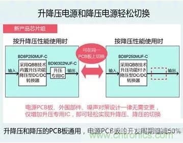 該芯片組融入了Quick Buck Booster技術(shù),從而可實(shí)現(xiàn)以往無(wú)法實(shí)現(xiàn)的升降壓電源和降壓電源的電源PCB板、外圍部件、噪聲對(duì)策的通用設(shè)計(jì)。