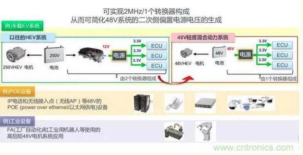 其中,一次電源主要是從48V或12V降到5V或3V,用于車載導(dǎo)航等。二次電源是從5V降到1.25到1V,用于ADAS(高級(jí)駕駛員輔助系統(tǒng))等,未來(lái)的技術(shù)趨勢(shì)是更小封裝,開發(fā)高附加價(jià)值的電源IC。