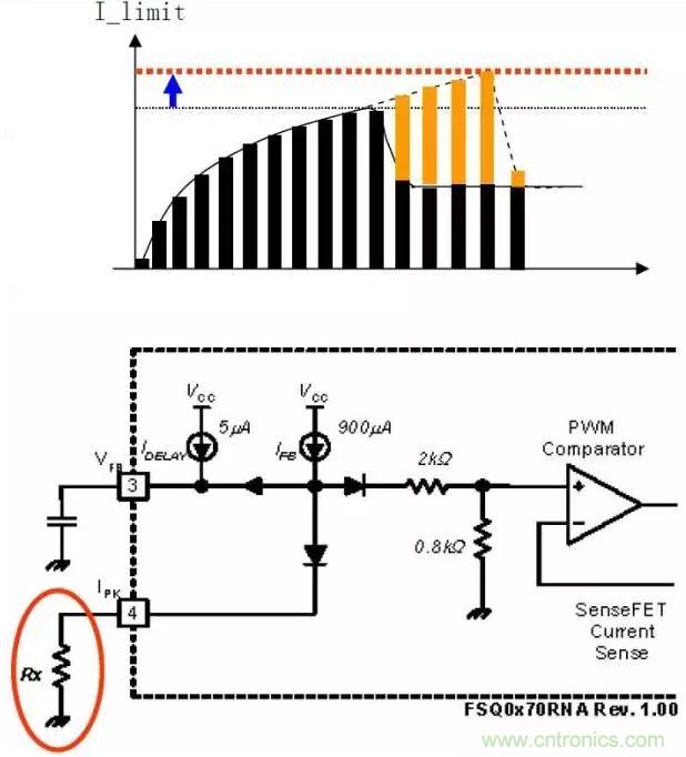 1)增大峰值電流限流點(diǎn)I_limit,可允許流過(guò)更大電感電流Id:將與Pin4相接的電阻增大,從內(nèi)部電流源Ifb分流更小,使作為電流限制參考電壓的PWM比較器正輸入端的電壓將上升,即允許更大的電流通過(guò)MOSFET/變壓器,可以提供更大的能量。