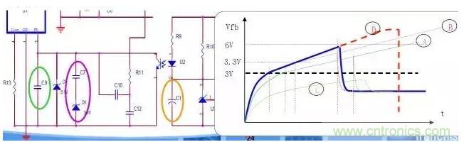 IC的OCP功能是檢測(cè)Vfb達(dá)到Vsd(如6V)實(shí)現(xiàn)的。所以要降低Vfb斜率,就可以延長(zhǎng)Vfb的上升時(shí)間。