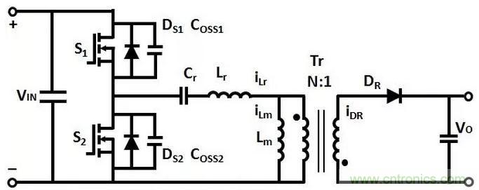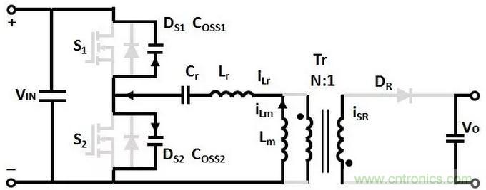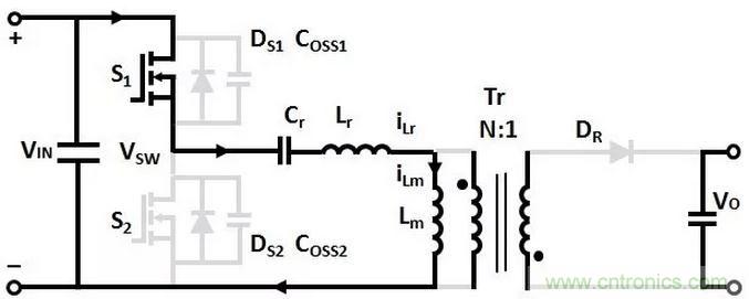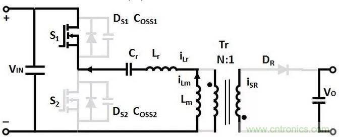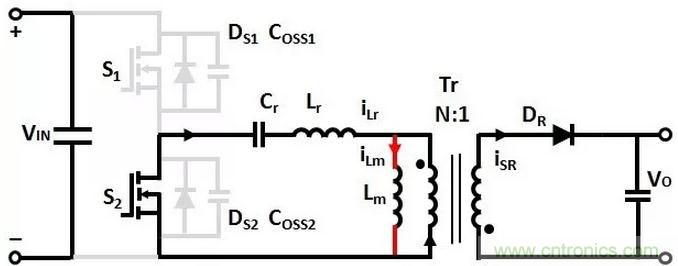 T1時(shí)刻,S1關(guān)斷,(Coss1+Coss2)和(Lr+Lm)諧振,Coss1充電,Coss2放電,直到T2時(shí)刻,Coss1的電壓充電到VIN,Coss2的電壓放電到0。