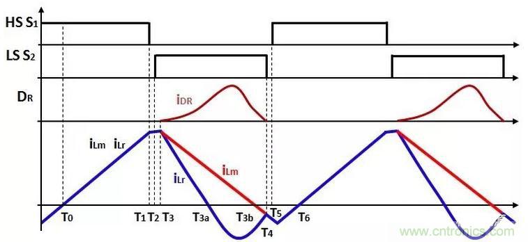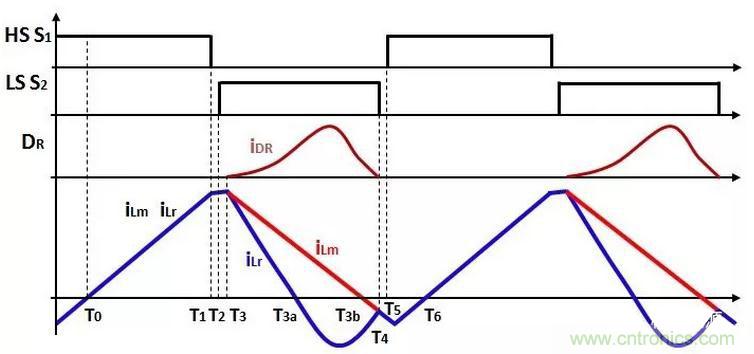 在這個(gè)階段,Lr和Cr串聯(lián)諧振,iLr過0后,反向繼續(xù)諧振;然后,經(jīng)過一段時(shí)間, iLm也過0,反向激磁繼續(xù)增加。
