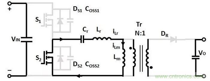 T4時(shí)刻,同時(shí)關(guān)斷SR和S2,(Coss1+Coss2)和(Lr+Lm)諧振,Coss1放電,Coss2充電,直到T5時(shí)刻,Coss2的電壓充電到VIN,Coss1的電壓放電到0。