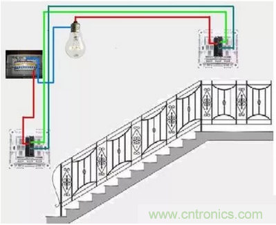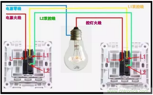 有的朋友說中間可不可以用雙聯雙控開關,也是可以的。不過雙聯開關上有兩個開關,需用同時按下。