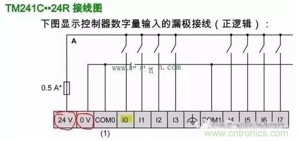 如圖三所示,這是PLC 的硬件手冊(cè),我們要想把接近開(kāi)關(guān)的信號(hào)接到輸入點(diǎn)I0上,也就是黃色熒光筆部分,該怎么辦呢?其實(shí)很簡(jiǎn)單,看紅色圓圈的部分,PLC已經(jīng)為我們提供了輸出電源,我們只需把接近開(kāi)關(guān)的三根線依次接上即可