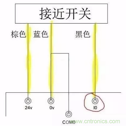如圖三所示,這是PLC 的實(shí)際接線,黃色熒光筆標(biāo)識(shí)的是接近開(kāi)關(guān)的三根接線,棕色和藍(lán)色分別接到PLC 的24V和0V上,黑色接到I0上。當(dāng)有物體到達(dá)接近開(kāi)關(guān)的感應(yīng)距離時(shí),PLC的I0便會(huì)有輸入,我們?cè)诔绦蚶锞涂梢宰鎏幚怼P枰⒁獾氖牵瑘D中0V和COM0短接,因此,這種接法適合PNP型的接近開(kāi)關(guān)。而NPN型的接近開(kāi)關(guān)按此接法,是不會(huì)有任何信號(hào)的。接近開(kāi)關(guān)的接線只和NPN,PNP類(lèi)型有關(guān)和感性 容性無(wú)任何關(guān)系。