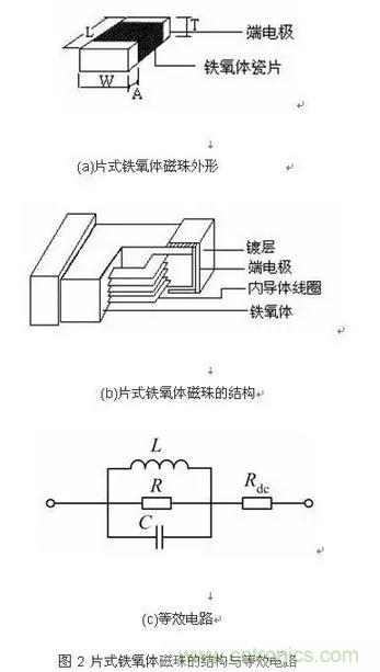 片式磁珠是目前應用、發展很快的一種抗干擾元件,廉價、易用,濾除高頻噪聲效果顯著。片式磁珠由軟磁鐵氧體材料組成,片式鐵氧體磁珠的結構和等效電路如圖2所示,實質上它就是1個疊層型片式電感器,是由鐵氧體磁性材料與導體線圈組成的疊層型獨石結構。由于在高溫下燒結而成,因而具有致密性好、可靠性高等優點。兩端的電極由銀/鎳/焊錫3層構成,可滿足再流焊和波峰焊的要求。在圖2所示的等效電路中,R代表由于鐵氧體材料的損耗(主要是磁損耗)以及導體線圈的歐盟損耗而引起的等效電阻,C是導體線圈的寄生電容。