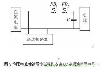 由于鐵氧體磁珠在電路中使用能夠增加高頻損耗而又不引入直流損耗,而且體積小、便于安裝在區間的引線或者導線上,對于1MHz以上的噪聲信號抑制效果十分明顯,因此可用作高頻電路的去耦、濾波以及寄生振蕩的抑制等。特別對消除電路內部由開關器件引起的電流突變和濾波電源線或其它導線引入電路的高頻噪聲干擾效果明顯。低阻抗的供電回路、諧振電路、丙類功率放大器以及可控硅開關電路等,使用鐵氧體磁珠進行濾波都是十分有效的。鐵氧體磁珠一般可以分為電阻性和電感性兩類,使用時可以根據需要選取。單個磁珠的阻抗一般為十至幾百歐姆,應用時如果一個衰減量不夠時可以用多個磁珠串聯使用,但是通常三個以上時效果就不會再明顯增加了[7]。如圖3示出了利用兩只電感性鐵氧體磁珠構成的高頻LC濾波器電路,該電路可有效的吸收由高頻振蕩器產生的振蕩信號而不致竄入負載,并且不降低負載上的直流電壓。