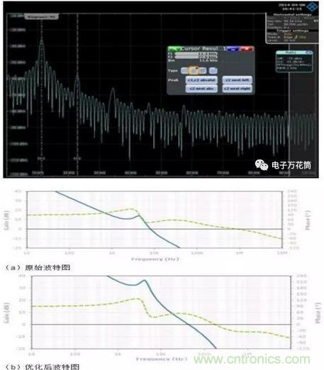 一般來(lái)說(shuō),11.3KHz應(yīng)該是VRM的管轄范圍,此處出現(xiàn)較大噪聲說(shuō)明VRM電路設(shè)計(jì)不能滿足 要求。這里對(duì)VRM的性能進(jìn)行分析,VRM分析的方法眾多,此處主要采用仿真其反饋環(huán)路波特圖的手段。波特圖主要觀察幾個(gè)關(guān)鍵信息:1、穿越頻率,增益曲 線穿越0dB線的頻率點(diǎn);2、相位裕度,相位曲線在穿越頻率處所對(duì)應(yīng)的相位值;3、增益裕度,相位在-360°時(shí)所對(duì)應(yīng)的增益值。這里我們主要關(guān)注穿越頻 率和相位裕度這兩個(gè)指標(biāo)。從VRM的環(huán)路波特圖(如下圖a)可以看到,VRM的穿越頻率在8KHz左右,相位裕度37度。這里存在兩個(gè)問(wèn)題:首先VRM的 相位裕度一般需要大于45度才能保證環(huán)路的穩(wěn)定工作,這里相位裕度稍小一些,需要增加相位裕度;其次穿越頻率太低,穿越頻率附近VRM的調(diào)整作用逐漸降低,而此頻點(diǎn)bulk電容還起不到作用,所以在8KHz附近會(huì)存在較高的阻抗,這個(gè)頻點(diǎn)的噪聲抑制作用較差。下圖(b)是優(yōu)化VRM環(huán)路之后的波特圖,調(diào)整相位裕度到50度,穿越頻率推到46KHz左右。