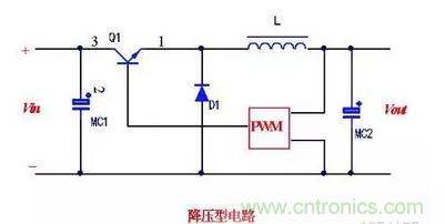 如下圖為降壓型電路。在此電路中,脈寬調制(pwm)電路的輸出加到晶體管開關Q1的基極,以控制其導通和截止。