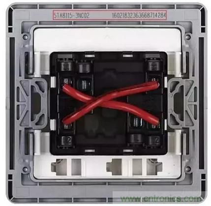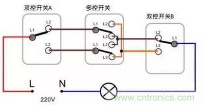 這里要新介紹一個開關,叫做三控開關。開關布置的順序是,單開雙控→三控開關→單開雙控。先看個三控開關的圖,能更好理解,如下: