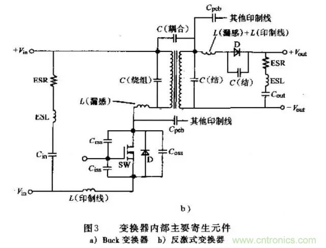 在所有開關電源中,有一些常見的寄生參數,在觀察變換器內主要交流節點的波形時,可以明顯看到它們的影響。有些器件的數據資料中,甚至給出了這些參數,如MOSFET的寄生電容。兩種常見變換器的主要寄生參數見圖3。