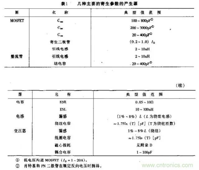 有些寄生參數已明確定義,如MOSFET的電容,其他一些離散的寄生參數可以用集中參數表示,使建模變得更加容易。試圖確定那些沒有明確定義的寄生參數的值是非常困難的,通常用一個經驗值確定,換句話說,在進行軟開關設計時,元器件的選擇以能得到最佳結果為原則來進行。在線路圖中,合適的地方放置寄生元件非常重要,因為電氣支路只在變換器工作的一部分時間內起作用。例如,整流器的結電容只有在整流器反向偏置時會很大,而當二極管正向偏置時就消失了。表l列出了一些容易確定的寄生參數和產生這些參數的元器件,以及這些值的大致范圍。某些特殊的寄生參數值可以從特定元器件的數據資料中獲得。
