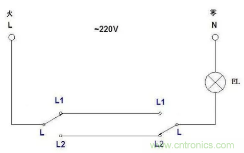 大家看這個接法,兩個單聯雙控的L1連一起接燈的控制線,兩個L2連一起接的是火線,燈接零線。這種接法也是很安全的,唯一的缺點就是費線。