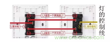 單控開關每組二個接線孔L接火線L1接燈控制線。雙控開關每組三個接線孔L接火線或燈控制線,L1丶L2接二根雙控回路線。