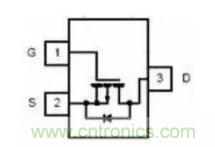仔細(xì)看看你會(huì)發(fā)現(xiàn),這兩個(gè)圖似乎有差別,對(duì)了,這實(shí)際上是兩種不同的增強(qiáng)型場(chǎng)效應(yīng)管,第一個(gè)那個(gè)叫N溝道增強(qiáng)型場(chǎng)效應(yīng)管,第二個(gè)那個(gè)叫P溝道增強(qiáng)型場(chǎng)效應(yīng)管,它們的的作用是剛好相反的。前面說(shuō)過(guò),場(chǎng)效應(yīng)管是用電控制的開(kāi)關(guān),那么我們就先講一下怎么使用它來(lái)當(dāng)開(kāi)關(guān)的,從圖中我們可以看到它也像三極管一樣有三個(gè)腳,這三個(gè)腳分別叫做柵極(G)、源極(S)和漏極(D),mpn中的貼片元件示意圖是這個(gè)樣子: