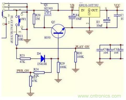 圖中電池的正電通過(guò)開(kāi)關(guān)S1接到場(chǎng)效應(yīng)管Q1的2腳源極,由于Q1是一個(gè)P溝道管,它的1腳柵極通過(guò)R20電阻提供一個(gè)正電位電壓,所以不能通電,電壓不能繼續(xù)通過(guò),3v穩(wěn)壓IC輸入腳得不到電壓所以就不能工作不開(kāi)機(jī)!這時(shí),如果我們按下SW1開(kāi)機(jī)按鍵時(shí),正電通過(guò)按鍵、R11、R23、D4加到三極管Q2的基極,三極管Q2的基極得到一個(gè)正電位,三極管導(dǎo)通(前面講到三極管的時(shí)候已經(jīng)講過(guò)),由于三極管的發(fā)射極直接接地,三極管Q2導(dǎo)通就相當(dāng)于Q1的柵極直接接地,加在它上面的通過(guò)R20電阻的電壓就直接入了地,Q1的柵極就從高電位變?yōu)榈碗娢唬琎1導(dǎo)通電就從Q1同過(guò)加到3v穩(wěn)壓IC的輸入腳,3v穩(wěn)壓IC就是那個(gè)U1輸出3v的工作電壓vcc供給主控,主控通過(guò)復(fù)位清0,讀取固件程序檢測(cè)等一系列動(dòng)作,輸處一個(gè)控制電壓到PWR_ON再通過(guò)R24、R13分壓送到Q2的基極,保持Q2一直處于導(dǎo)通狀態(tài),即使你松開(kāi)開(kāi)機(jī)鍵斷開(kāi)Q1的基極電壓,這時(shí)候有主控送來(lái)的控制電壓保持著,Q2也就一直能夠處于導(dǎo)通狀態(tài),Q1就能源源不斷的給3v穩(wěn)壓IC提供工作電壓!SW1還同時(shí)通過(guò)R11、R30兩個(gè)電阻的分壓,給主控PLAY ON腳送去時(shí)間長(zhǎng)短、次數(shù)不同的控制信號(hào),主控通過(guò)固件鑒別是播放、暫停、開(kāi)機(jī)、關(guān)機(jī)而輸出不同的結(jié)果給相應(yīng)的控制點(diǎn),以達(dá)到不同的工作狀態(tài)!