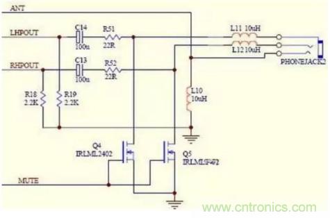 上圖是一個(gè)有主控控制耳機(jī)有沒(méi)有聲音輸出的電路圖,聲音的左右聲道分別通過(guò)隔直流電容C13、C14和電阻R51、R52送到耳機(jī)孔,但是在電阻R51、R52和耳機(jī)孔之間卻接入了一個(gè)N溝道的mos場(chǎng)效應(yīng)管,這個(gè)場(chǎng)效應(yīng)管的柵極連接在一起受著MUTE的控制,當(dāng)MUTE的地方處于高電位時(shí)候,Q4、Q5導(dǎo)通,就會(huì)把聲音通過(guò)Q4、Q5入地,耳機(jī)里就不會(huì)有聲音了,當(dāng)MUTE的地方處于低電位時(shí)候,Q4、Q5關(guān)斷,聲音就只有通過(guò)耳機(jī)而發(fā)出聲音了!