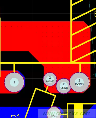 47.PCB的熱點區域一定要遠離輸入、輸出端子,防止噪聲源串到線上導致EMI變差,在不得已而為之時,可增加地線或其它屏蔽方式進行隔離,如下圖增加了一條地線進行有效隔離。