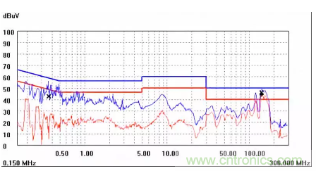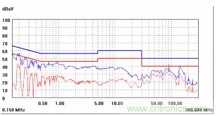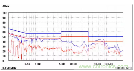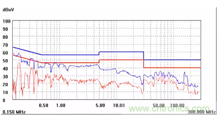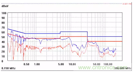 圖一a可以看出,改變PCB布局后130M-200M已經完全被衰減,但是30-130M沒有圖一效果好,可能變壓器出線無交叉好一些。仔細觀察,此IC具有抖頻功能,傳導部分頻段削掉了一些尖峰;