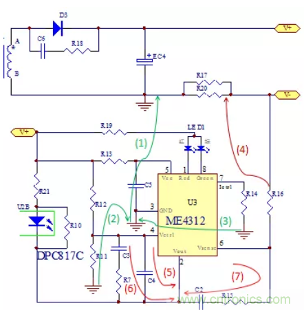 如(1)(2)(3)綠線所示,R11的地和R14的地連接到芯片的地,再連接到EC4電解電容的地。注意不可連到變壓器的地,因為變壓器次級A->D3->EC4->次級B形成功率環,如果ME4312芯片的地接到次級B線到EC4電容之間,受到較強的di/dt干擾會導致系統的不穩定等因素。