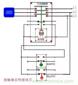 首先電源三相分別接接觸器的主觸點(diǎn)L1,L2,L3,再?gòu)慕佑|器的T1,T2,T3接出三根線接電機(jī)的三個(gè)接線柱,以上是主電路。