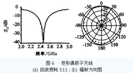 從圖5b 可以看到在天線軸方向上,天線幾乎無(wú)輻射. 如果此時(shí)讀寫(xiě)器處于該方向上,應(yīng)答器將不會(huì)做出任何反應(yīng). 為了獲得全方位輻射的天線以克服該缺點(diǎn),可以對(duì)天線做適當(dāng)?shù)淖冃?如在將偶極子天線臂末端垂直方向上延長(zhǎng)λ/ 4 成圖4c 所示. 這樣天線總長(zhǎng)度修改為(57. 0 mm + 2 ×28. 5 mm) ,天線臂寬仍然為1 mm. 天線臂延長(zhǎng)λ/ 4 后,整個(gè)天線諧振于1 個(gè)波長(zhǎng),而非原來(lái)的半個(gè)波長(zhǎng). 這就使得天線的輸入阻抗大大地增加,仿真計(jì)算結(jié)果約為2 kΩ. 其輸入回波損耗S11如圖6a 所示. 圖6b 為E 面(天線平面) 上的輻射場(chǎng)方向圖,其中實(shí)線為仿真結(jié)果,黑點(diǎn)為實(shí)際樣品測(cè)量數(shù)據(jù),兩者結(jié)果較為吻合說(shuō)明了該設(shè)計(jì)是正確的. 從圖6b 可以看到在原來(lái)弱輻射的方向上得到了很大的改善,其輻射已經(jīng)近似為全方向的了. 電壓駐波比(VSWR) 小于2. 0 時(shí)的阻抗帶寬為12.2 % ,增益為1.4 ,對(duì)于大部分RFID 應(yīng)用系統(tǒng),該偶極子天線可以滿足要求.