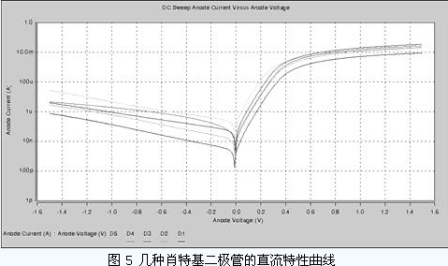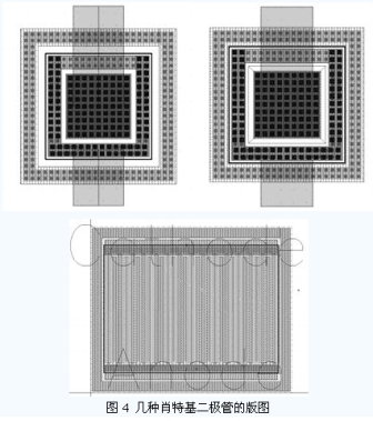 圖4 所示是在UMC 0.18um CMOS 工藝下設(shè)計(jì)的幾種肖特基二極管的版圖。它們的直流特性測試曲線如圖5 所示。從直流特性的測試結(jié)果
