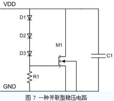 在RFID 標(biāo)簽芯片中,需要有一個較大電容值的儲能電容存儲足夠的電荷以供標(biāo)簽在接收調(diào)制信號時,仍可在輸入能量較小的時刻(例如OOK調(diào)制中無載波發(fā)出的時刻),維持芯片的電源電壓。如果輸入能量過高,電源電壓升高到一定程度,穩(wěn)壓電路中電壓感應(yīng)器將控制泄流源將儲能電容上的多余電荷釋放掉,以此達(dá)到穩(wěn)壓的目的。圖7 是其中一種并聯(lián)型穩(wěn)壓電路。三個串聯(lián)的二極管D1、D2、D3 與電阻R1 組成電壓感應(yīng)器,控制泄流管M1 的柵極電壓。當(dāng)電源電壓超過三個二極管開啟電壓之和后,M1 柵極電壓升高,M1 導(dǎo)通,開始對儲能電容C1 放電。