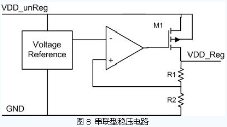 另外一類穩(wěn)壓電路的原理則是采用串聯(lián)式的穩(wěn)壓方案。它的原理圖如圖8 所示。參考電壓源是被設(shè)計(jì)成一個與電源電壓無關(guān)的參考源。輸出電源電壓經(jīng)電阻分壓后與參考電壓相比較,通過運(yùn)算放大器放大其差值來控制M1 管的柵極電位,使得輸出電壓與參考源基本保持相同的穩(wěn)定狀態(tài)。