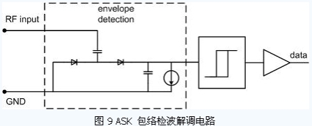 出于減小芯片面積和功耗的考慮,目前大部分無源RFID 標(biāo)簽均采用了ASK 調(diào)制。對于標(biāo)簽芯片的ASK 解調(diào)電路,常用的解調(diào)方式是包絡(luò)檢波的方式,如圖9 所示。
