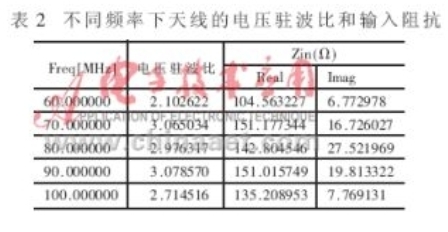 從文獻(xiàn)中可以查到本文所仿真的天線輸入電阻值約為150Ω,從文獻(xiàn)可以查到輸入電抗約為20Ω左右。實(shí)際上,不僅天線的輸入電抗與頻率有關(guān),而且不同頻率下輸入電阻也不同,利用仿真軟件可以比較準(zhǔn)確地得到這些參數(shù)。表2給出了幾種頻率下天線的輸入電阻與電抗值。從表2可以看出,仿真結(jié)果的輸入阻抗在工作頻帶內(nèi)與理論值有一定差別,隨著頻率接近天線頻率范圍的上下限,仿真結(jié)果與理論值相差越大。通過(guò)仿真計(jì)算所得到比較準(zhǔn)確的天線輸入阻抗,對(duì)于研究調(diào)制電路與天線的匹配問(wèn)題有著非常重要的作用。