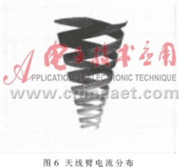 圖6表示頻率f=80MHz時(shí)電流在天線臂上的分布,可以看出傳導(dǎo)電流從天線饋電點(diǎn)(即圓錐頂部一端)流入,先經(jīng)過(guò)傳輸區(qū)(約下面的2圈),再向上是輻射區(qū)(約第3圈),最后為衰減區(qū)(后面幾圈)。在傳輸區(qū)內(nèi),電流大小變化不明顯,到達(dá)輻射區(qū)后,隨著大量能量以電磁波的形式傳播,電流迅速減小,最后經(jīng)過(guò)衰減區(qū),電流逐漸減小至零,這符合天線一般規(guī)律。其中,輻射區(qū)的位置與頻率有關(guān),即位于波長(zhǎng)近似于圓錐截面周長(zhǎng)的地方??梢韵胂?,不同頻率會(huì)對(duì)應(yīng)不同的輻射區(qū)位置,這是CLS天線的工作特性,也是CLS天線具有寬帶特性的原因。