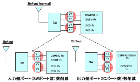 在手機的高頻率無線通信電路中使用的表面波濾波器,分為CDMA收發(fā)用的級間濾波器和GSM用的TOP濾波器等。村田的濾波器不僅具有低損耗和高抑制度的電特性,還由小型、薄型的各種產(chǎn)品尺寸構(gòu)成了豐富的商品線,可以對應(yīng)各種電路設(shè)計的需求。例如, 在多頻段發(fā)展的高頻無線通信電路中,為了減小電路基板上的貼裝面積,將兩個頻帶的單濾波器(產(chǎn)品尺寸1.35×1.05×0.5mm)合二為一,制造出了雙濾波器(產(chǎn)品尺寸1.8×1.35×0.5mm)。此外還運用特殊的技術(shù)制造許多獨特的商品,如將雙層濾波器的輸入端合并為一個的1in4out產(chǎn)品,以及將平衡器的輸出端合并為一的2in2out產(chǎn)品等。通過共用輸入端可以節(jié)省原本用于分頻的開關(guān)(SW)。同時,共用平衡輸出端可以使連接濾波器的高頻IC的端口數(shù)目減少(圖3)。這是在表面波濾波器的設(shè)計中通過調(diào)整阻抗和相位等方法,從而使差分端口實現(xiàn)共用。這些濾波器可以在多頻帶化發(fā)展的高頻無線電路中,為外圍電路的簡化及電路整體的小型化做出貢獻。今后村田制作所將繼續(xù)致力于研發(fā)更小型化和高性能化,同時又具有輸入端以及輸出端共用功能的單濾波器、雙濾波器產(chǎn)品。