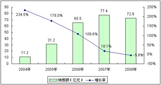 圖2 2004-2008年中國安防領(lǐng)域RFID市場規(guī)模與增長(銷售額)