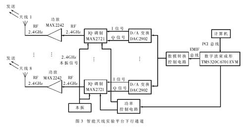 圖3給出智能天線實驗平臺下行通道的框圖。待發送數據由計算機通過PCI總線傳給C6701EVM評估板,C6701DSP根據波束成形的需要生成各通道所需的數字基帶I/Q信號;D/A變換器DAC2902把數字基帶I/Q信號變成模擬I/Q信號,為了保持各通道信號的相位關系,各路D/A變換器采用統一的時鐘啟動D/A變換,各路D/A變換器的控制信號由D/A變換控制電路產生;各通道模擬I/Q信號由零中頻I/Q調制器MAX2721上變頻到2.4GHz的射頻信號,經過功率放大器MAX2242放大后送到天線陣列輻射,形成下行波束;各通道I/Q調制器所需的本振信號由統一的信號源產生以保證各通道的相位關系;C6701EVM通過McBSP發送命令到功率控制電路產生控制信號到MAX2721的功率控制端,控制天線陣列的輸出功率。[page]