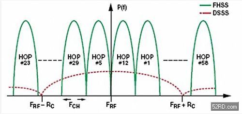跳頻展頻(FHSS)發(fā)射技術(shù)是藉由將頻譜切割為一定數(shù)量的頻道,以便把時域中的能量加以分散,并在這些頻道之間依虛擬隨機(jī)(pseudorandom)順序進(jìn)行跳躍,或是稱之為跳碼(hoppingcode),這是接收機(jī)與發(fā)射機(jī)中所為人熟悉的。為了迎接新加入網(wǎng)路中的節(jié)點(node),控制節(jié)點會週期性的送出一標(biāo)識(beacon)信號,讓新加入的節(jié)點能與其進(jìn)行同步,同步所須時間會依標(biāo)識期間長度及跳躍的頻道的數(shù)量而定。美國與歐洲標(biāo)準(zhǔn)都制訂了相似數(shù)量的跳躍頻道,以及400ms的最大停留(dwell)時間(在任何單一跳躍期間內(nèi),于某一特定頻率上所花費的時間)。