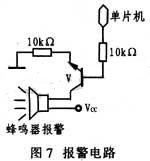 顯示電路采用4位共陽(yáng)LED數(shù)碼管,碼段由74LS244驅(qū)動(dòng)電路驅(qū)動(dòng);驅(qū)動(dòng)電路由PNP晶體管8550驅(qū)動(dòng)。圖7給出報(bào)警電路。它采用晶體管驅(qū)動(dòng)。