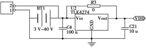 無(wú)線傳感器通常的工作電壓范圍為3.0V~3.6V。此次電源設(shè)計(jì)加入了TLFA274穩(wěn)壓器(如圖2所示),可轉(zhuǎn)換3V~40V的電壓,比如通常使用的小型電池或者是汽車(chē)電池,給使用者帶來(lái)了很大的方便。