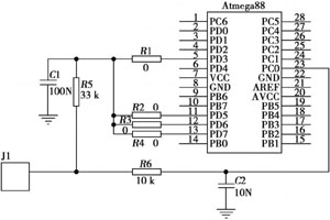 對(duì)微控制器芯片選擇Atmel ATmega88,因?yàn)樗哂械凸模€有待機(jī)模式和主動(dòng)模式的快速轉(zhuǎn)換功能,所以無(wú)線傳感器能夠在非常短的時(shí)間完成數(shù)據(jù)的測(cè)量和傳輸;它有一個(gè)內(nèi)置的掉電檢測(cè)電路,可用來(lái)提醒用戶傳感器網(wǎng)絡(luò)電池是否需要更換;它還有一個(gè)內(nèi)置的A/D轉(zhuǎn)換器,可以將傳感器的模擬信號(hào)轉(zhuǎn)換成具有10位數(shù)字值的數(shù)字信號(hào)(零代表0V,210-1代表電源電壓和最大可能電壓)。