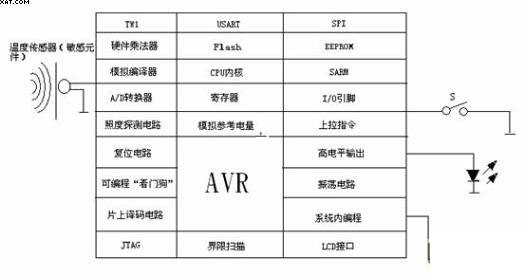 占有傳感器實質(zhì)上是一種智能式的微控制器,主要有敏感元件、微處理器、信號接收與處理電路、開關(guān)及發(fā)光LED等部分組成。其中微處理器或稱作微控制器是采用美國Atmel公司生產(chǎn)的低電壓、高性能的AVR 8-bit RISC微控制器,又稱作Atmega88。此微控制器屬于片上型微處理器,以CIP-51為內(nèi)核,它本身集成了許多外圍設(shè)備,如A/D和D/A轉(zhuǎn)換器、1kB 的SRAM、可編程的8kB的 FLASH存儲器、512字節(jié)的EEPROM、一個內(nèi)部RC振蕩器等。所有的I/O端口的每一個引腳都置上拉電阻,根據(jù)要求可獨立地通與斷。片上定時器/計數(shù)器具有定時、捕獲、比較和PWM輸出等功能。Atmega88結(jié)構(gòu)框圖如圖1所示。
