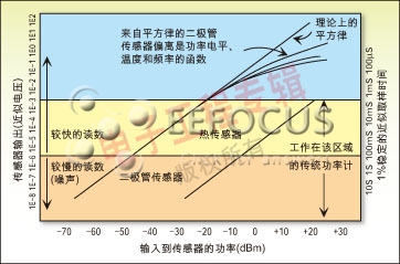 圖2所示為熱電堆單元和二極管檢測器的響應(yīng)。傳統(tǒng)的二極管檢測器要么工作在平方律區(qū)域,因此動態(tài)范圍被限制為50dB;要么采用線性校正技術(shù)來擴展它們的動態(tài)范圍。這種技術(shù)受到功率計速度的限制,并且不適合于系統(tǒng)傳輸?shù)姆柭蔬h(yuǎn)遠(yuǎn)超過功率計采樣率的應(yīng)用。