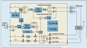 RF集成一個重要的發展出現在大約三年以前,當時RF技術和數字基帶調制解調器的發展使得在無線手機中用直接下變頻接收器替代超外差射頻器件成為可能。超外差射頻器件使用多級混頻器、濾波器和多個電壓控制振蕩器(VCO),已經很好地應用了多年,但直接變頻射頻器件的集成度能夠大大減少GSM RF總體元件數。在上世紀九十年代后期,一個典型的單頻段超外差RF子系統包括PA、天線開關、LDO、小信號RF和VCTCXO,需要大約200個分立器件;今天,我們能夠設計一個具有四頻段功能的直接變頻系統,集成了VCO、VCXO和PLL回路濾波器,而它的元件數卻少于50個。