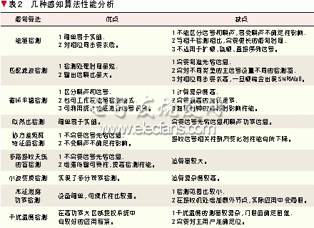 以上這些算法都是對(duì)主用戶發(fā)射端信號(hào)的直接檢測(cè),基本都是從經(jīng)典的信號(hào)檢測(cè)理論中移植過來的。此外,近期一些文獻(xiàn)從主用戶接收端的角度提出了本振泄露功率檢測(cè)和基于干擾溫度的檢測(cè)。有些文獻(xiàn)對(duì)經(jīng)典算法進(jìn)行了改進(jìn),如文獻(xiàn)[2]提出了一種基于能量檢測(cè)-循環(huán)特征檢測(cè)結(jié)合的兩級(jí)感知算法。文獻(xiàn)[3]研究了基于頻偏補(bǔ)償?shù)钠ヅ錇V波器檢測(cè)、聯(lián)合前向和參數(shù)匹配的能量檢測(cè)、多分辨率頻譜檢測(cè)和基于小波變換頻譜檢測(cè)等。表2歸納了文獻(xiàn)中提及較多的一些感知算法,并對(duì)其優(yōu)缺點(diǎn)進(jìn)行了比較。
