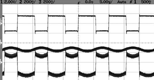 圖6b: 大電機電阻,占空比60%、感應電阻0.1Ω。軌線1是電壓。軌線2為電流,軌線3為瞬時功率。