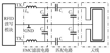 EMC濾波電路濾去了載波頻率為13. 56 MHz阻抗變換時(shí)的諧波干擾。它有一個(gè)固定的諧振頻率,這個(gè)頻率是實(shí)際數(shù)據(jù)傳輸率和最高副載波頻率的結(jié)合。如用曼切斯特編碼時(shí),傳輸?shù)淖罡邤?shù)據(jù)率為424 kbit/ s,頻率為848 kHz,則諧振頻率為14. 408MHz。