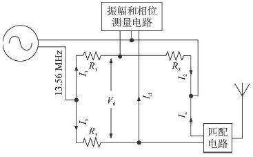 (1)測(cè)量電橋 用來測(cè)試天線的反射系數(shù)。主體部分為惠斯通電路,如圖4所示。其電路中的直流電源用波形產(chǎn)生器替代,用來生成13. 56 MHz的正弦載波信號(hào)。其中電阻R1、R2、R3 都為50 Ω。